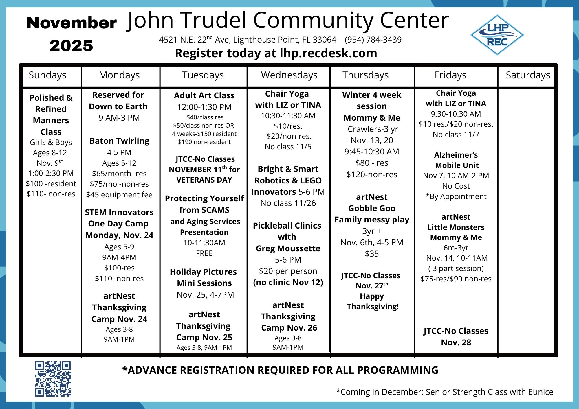 The John Trudel Community Center offers many different classes for all different age groups. We offer classes such as: chair yoga, art, robotics, Senior activities, and more at the JTCC.